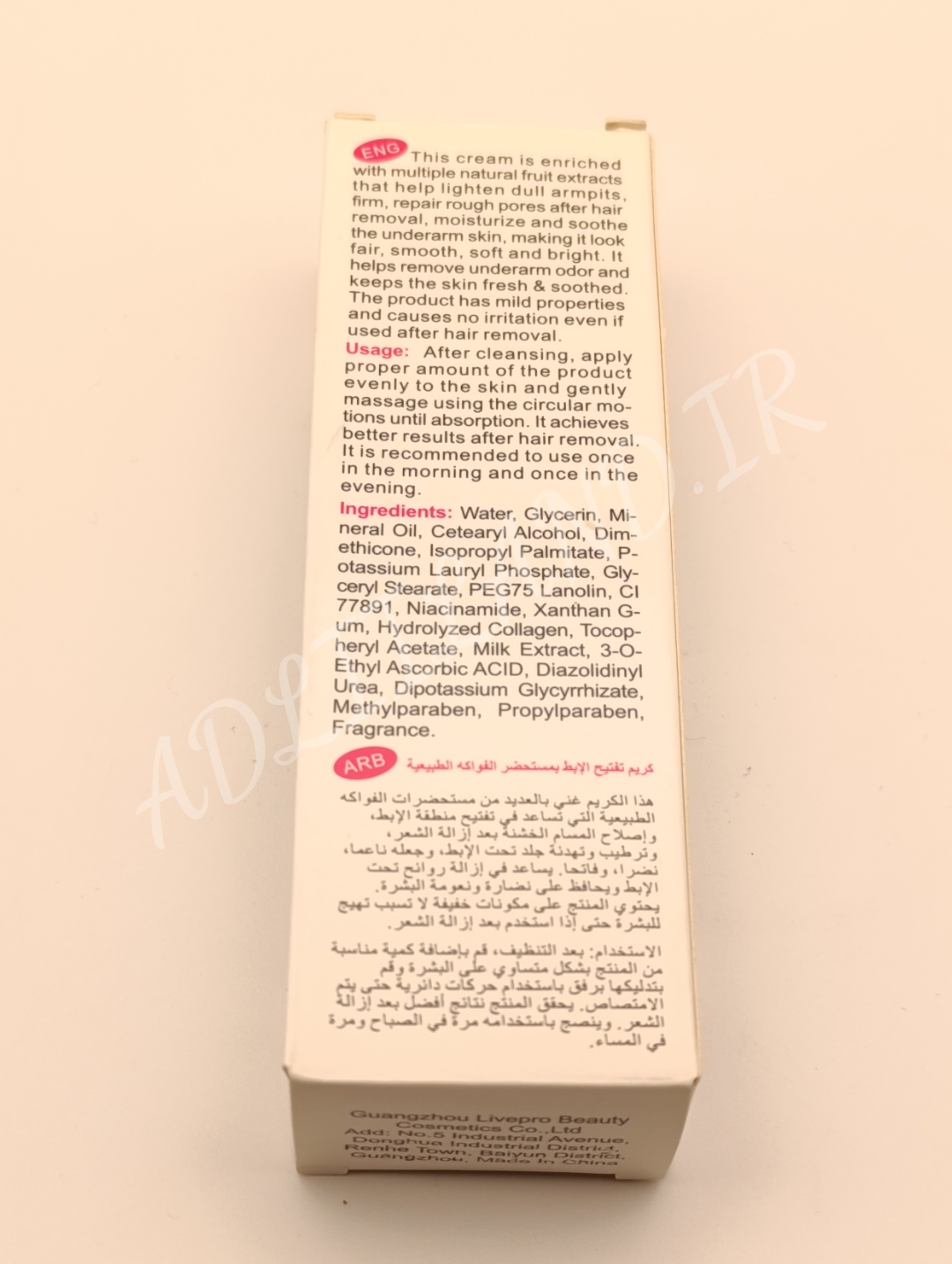 این محصول با ترکیبات مؤثر مانند آربوتین، ویتامین E و عصارههای طبیعی ساخته شده است تا به صورت عمیق به پوست نفوذ کرده و نواحی تیره زیر بغل، کشاله ران، آرنج و بین پاها را روشنتر کند.